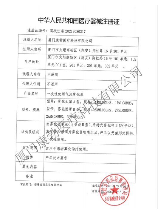 一次性使用氣流霧化器-無菌 產(chǎn)品注冊證及地址變更文件